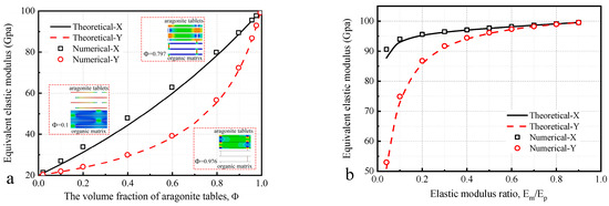 Figure 4a shows the effect of different volume fraction of tables on the equivalent elastic modulus, where the volume fraction of tables is controlled by the thickness of the different components. With the volume fraction of aragonite tablets increasing, the equivalent elastic modulus increases in both X and Y directions. When , the equivalent elastic modulus of the composite is 20 Gpa, and the structure consists of only the slurry. When , the equivalent elastic modulus of the composite is 100 Gpa, and the structure consists of only the tablets. Because of the difference of structural form in X and Y direction, when , the equivalent elastic modulus increases more in the X direction than Y direction. When , the equivalent elastic modulus increases more in the Y direction than X direction. When the volume fraction of the tablet is greater than 90%, which means that the volume fraction of the slurry is less than 10%, better isotropic properties and equivalent elastic modulus can be achieved.
