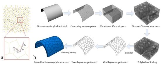 (a) The 2D Voronoi polygon structure; (b) generation of the nacre-like structure with Voronoi polygons.