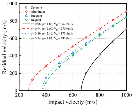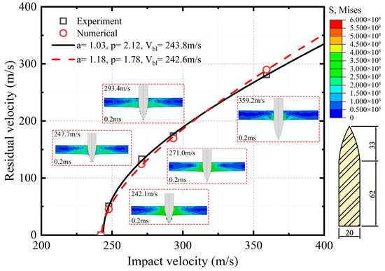 The Johnson–Cook material model was validated by referring to the perforation experiments of aluminum armor plate by Borvik et al. [58]. Racht–Ipson model is used to fit the residual velocity curve [59], its formula is as follow: