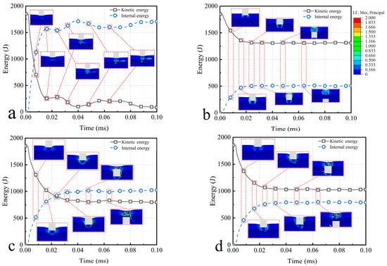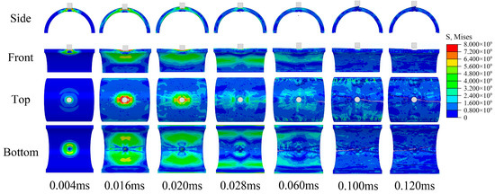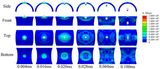 The impact response of the semi-cylindrical composite shells is observed from different directions, as shown in Figure 9 and Figure 10. Two different distribution forms of the semi-cylindrical shells are penetrated by the bullet, and the penetration process can be divided into four stages:
