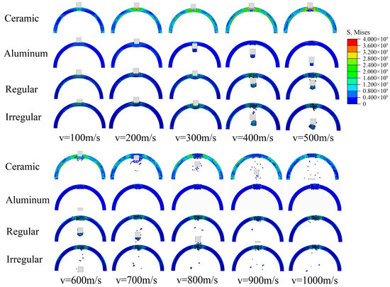 Based on bullet perforation experiments, the axisymmetric algorithm was used to build a circular plate with a diameter of 500 mm and a thickness of 20 mm. The local stress plots of the bullet penetrating the aluminum plate at different impact velocities are captured, and the bullet geometry is shown in Figure 8. The comparison shows that the maximum residual velocity difference between numerical and experiment is 10.4% at the impact velocity of 247.7 m/s, and the difference is lower as the impact velocity increases. The numerical calculations show agreement with the experiments, indicating that the aluminum material model is reliable.