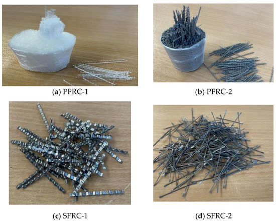 The construction industry uses a wide range of composite materials, the most common of which is concrete. Concrete offers good strength and durability in constructing structures, but is brittle in nature [1,2]. This is better for structures working under compressive loads. However, in applications where structures are under bending or tension, it is deemed necessary to reinforce concrete with materials that can provide the required ductility and not reduce the most needed compressive strength [3,4,5]. Due to this reason, academic and industrial domain researchers have used fibres of small sizes with good flexural and tensile properties as a constituent of concrete [4,6,7,8,9,10,11]. In the past, steel fibres (SF) were added to recycled aggregate concrete (RAC) and demonstrated an increase in tensile strength, elastic modulus, and post-cracking behaviour [12,13]. The researchers found that SFRC suits the structures that experience loads over the serviceability limit state in shear, bending, and impact or dynamic forces under seismic or cyclic activity [14,15]. It was found that the percentage of fibre by volume has little effect on compressive strength [15,16]. Utilizing fly ash and/or PVA fibre refines the pore structure, thereby enhancing frost resistance. In contrast, MgO and SRA are less effective than PVA fibre and fly ash at refining the pores, resulting in smaller and relatively weakened frost resistance [17]. There is no correlation between the compressive strength and abrasion resistance of hydraulic concretes containing MgO and/or PVA fibre and the pore structure parameters and pore surface fractal dimensions [18].