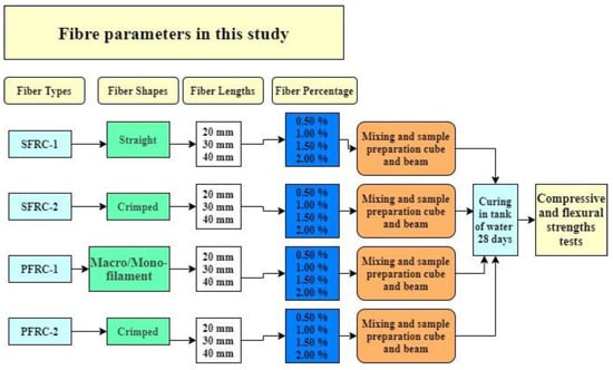 A slump target in the range from 3 cm to 6 cm and a specific strength of 30 N/mm2 for 28 days were set (see Appendix A, Figure A1). The prepared concrete blend had a water-cement (w/c) ratio of 0.52. The amounts for mixing 1 m3 of control concrete are shown in Table 2. Reinforced concrete mixers were created using a one-axis horizontal mixer. This study included 49 FRC mixes, together with a control mix. For instance, type-1 fibre (S1) was used to generate 12 concrete mixtures with varying lengths of fibre (20 mm, 30 mm, and 40 mm), each length accounting for a different percentage (0.5%, 1%, 1.5%, and 2%) of fibres that replaced the cement in the concrete mix. The test components were submerged in a water tank for 28 days at ambient temperature (20 ± 5 °C). According to the UK Department of the Environment (DoE1975) method for the “Design of Normal Concrete Mixes” [55], the technique adhered to the standard 28-day hardening requirement for concrete. Figure 2 presented the comprehensive schematic for the experimental plan.