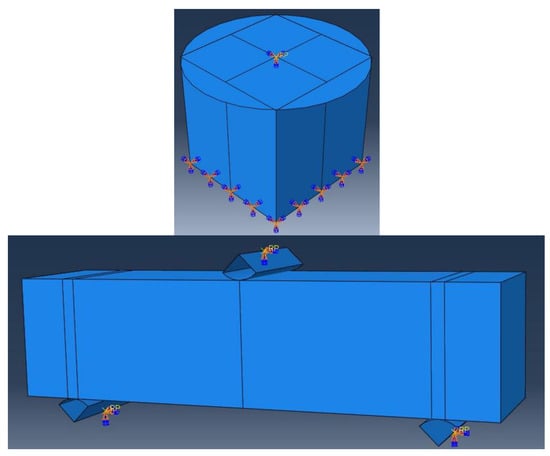 The cube and beam geometry design procedures of the experiments given in the previous part were created in this study using Abaqus software 2019 [65]. The concrete model consisted of plain concrete (cube, beam), steel and plastic fibres, and loading/support. Embedding the fibres in the concrete region is assumed to lead to a perfect bond between the concrete and the fibres. It is worth mentioning that slipping behaviours have the same bond idea for both beam and cube. Despite this, the perfect bonding assumption has been widely utilized in the literature for concrete-like structures [66,67].
