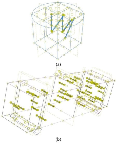 The CDPM in Abaqus is utilized in this study to describe compressive strength in normal concrete, assuming that the fibres are randomly distributed in the matrix and the FRC is thus considered as a homogeneous material. The default settings of the model parameters defining its operation in a complex stress state (, f, , Kc) [70] were used for the numerical analysis of FRC beams and cubes, and are shown in Table 3. According to the standard [71], the Poisson’s ratio of uncracked concrete is supposed to be 0.2. Table 4 and Table 5 present a representative summary of the concrete characteristics of the Abaqus software, as described by Shin et al. [72]. The effects on FRC were carefully monitored and minimized in this research using concrete damage plasticity DCP models to obtain quasi-static behaviours from the Standard-Explicit model simulation. Readers are urged to look up comprehensive discussions on quasi-static simulations using the Standard-Explicit model in the literature [73,74,75]. A fixed boundary condition (BC) was used at the bottom of the cube surface, with vertical displacement defined at the top. The BCs of the experiment were simplified by employing a 50 mm diameter supporting and loading cell, as shown in Figure 4. A fixed BC was used for the beam sample at the bottom of the supporting cell, with vertical displacement defined at the top of the loading bars. As the finite element (FE) simulations were run using the Standard-Explicit model, the vertical displacement was applied smoothly and slowly to minimize any noticeable load effects. The function “*AMPLITUDE, DEFINITION = SMOOTH STEP” was utilized to enforce the smooth and slow displacement BC. The bulk viscosity option was chosen to limit the load effects on the numerical results [65]. The constitutive plasticity rule was used to model the nonlinear, elastic behaviour (containing four different fibre shapes) of the steel and plastic fibres. The plasticity model assumed that steel and plastic fibres behaved similarly to the steel reinforcement behaviour used in the literature [66,76,77]. Digimat-FE software 2019 was used for the composite materials to obtain the random distribution of fibres inside the concrete samples [78]. The fibre distribution and interaction between fibres and concrete are shown in Figure 5. The small yellow square is the interaction between load and support cells with the surface, and the small yellow circle is the interaction between fibre and concrete as shown in Figure 5. Tensile tests, comprising elastic modulus, stress, and strain, were used to provide the inputs for the plasticity model. The plasticity properties of the fibres are shown in Table 6 and Table 7.