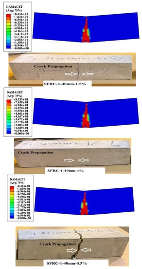 In numerical model, the samples were notched in the centre and failed in their flexural capacity, with a substantial crack down the length of the beam. The typical failure mechanisms of the 48 beams are shown in Figure 10 and Figure 11. Although the beam geometry, boundary, and loading conditions were all symmetric, the cracks in several of the beams were slightly convoluted and strayed from the centre beamlines. This is due to the random distribution and orientation of the steel and plastic fibres [89,90], which increases the crack-tip stress fields and the extremely heterogeneous local tensile strength and fracture toughness, as in ordinary concrete where aggregates behave similarly to steel fibres [91]. This cannot be accurately represented by the homogeneous models used in this investigation and can only be simulated by models that directly or indirectly consider random heterogeneity [22,92,93]. According to the CDPM, two failure processes for flexural strength were observed in this study. When a vertical crack propagates from the corners of the opening to the applied load and support, the first mode is a diagonal splitting failure. When a diagonal fracture forms in the shear span, it causes high strains inside the compression chord of the apertures next to the site of the loads. Figure 10 shows how the damage to concrete plasticity in the simulation creates failures consistent with actual observations. There were noticeable differences between the numerical and experimental data for the mechanical properties in previous research, including flexural and cracking tensile strength [94,95,96]. The-max load in the middle and max displacement of SFRC-2 beams obtained from the numerical model, and that load was used to calculate the flexural strength according to BS EN 12390-6 (2009). This is comparable to the experimental results obtained from the specimens in this study, as shown in Table 1 with different lengths, shapes, and percentages of fibre. The contour plots in Figure 10 and show the damage levels in various colours, ranging from the most severe to the least, in red, yellow, green, and blue. The images show that the crack propagation of beam distribution is equal along the middle axis, similar to the beam in the experimental observation. The estimation of the flexural strength for all the beams is also acceptable in terms of agreement with the experimental results.