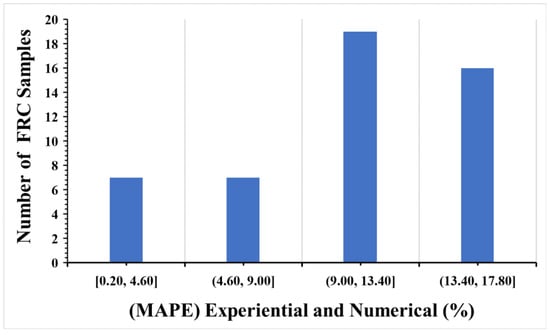 As demonstrated in this study, the CPD model can predict the optimal fibre with acceptable accuracy to obtain a compressive strength adequate for usage in a structure. This may stimulate the use of the concrete damage plasticity model in forecasting the compressive properties of concrete generated by different fibre materials in the future. To assess the accuracy of the numerical model in this study, the compressive strength of SFRC had the lowest and most significant errors, and the MAPE was between 0.52% and 5.53%; Figure 14 shows the MAPE results for the experimental and numerical models. Table 8 shows the evaluations used to analyses the results output of compressive strength. As shown in Figure 15 the selected linear polynomial seems a poor fit, but it is fine to predict the values of compressive s as the standard deviation is within a range of (0.03 to 2.6) and (0.04 to 0.8) MPa.