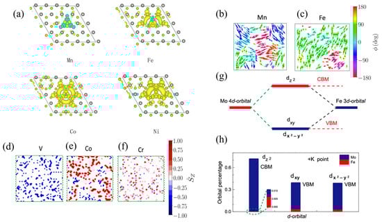 (a) Spin density for a single transition metal dopant atom (Mn, Fe, Co, Ni) in a monolayer WSe2 supercell with a 6.25% doping concentration of transition metals. The gray and green balls represent W and Se atoms, respectively. Yellow and cyan isosurfaces represent positive and negative spin densities [9]. (b–f) The magnetically ordered state of the Mn- (b), Fe- (c), V- (d), Co- (e), and Cr-doped (f) samples of MoSe2 with an atomic substitution of 15%, at a temperature of 5 K [9]. (g) Diagram of Fe and Mo atoms hybridized in d-orbitals for a 5 × 5 MoS2 supercell with one Fe atom instead of one Mo atom. (h) Percentage of hybridized d-orbitals of the Fe-doped monolayer MoS2 for each isolator d-orbital. The valence band maximum is predominantly composed of the dx2−y2 and dxy orbitals of both Mo and Fe, whereas the conduction band minimum is primarily dominated by the dz2 orbitals. Although the Fe d-orbitals contribute to the orbital hybridization, their relative fractions are comparatively small compared to Mo d-orbitals [34].