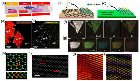 (a) Schematic of powder vaporization techniques used to synthesize manganese-doped and undoped MoS2 [21]. Schematic of the growth substrates, including (b) graphene and (c) insulating substrate (sapphire and SiO2). (d) Element analysis of Mn-doped MoS2 with (e) Mn concentrations (yellow pixels) that are equal (or higher) to those found in the MoS2 areas, which suggests that Mn may be bound to the substrate surface rather than incorporated into it [21]. (f,g) STEM-HAADF images of (f) pure WTe2 and (g) Cr0.02–WTe2 samples with their corresponding element mapping images [54]. (h) Schematics of the monolayer Fe:MoS2 with S, Mo, and Fe atoms denoted by green, blue, and red spheres. (i) Contrast-corrected STEM image of monolayer Fe:MoS2. The arrow shows iron atoms position in crystal lattice. Scale bar: 1 nm. [47]. (j) Typical atomic-resolution ADF-STEM image of Fe-doped monolayer 1H-MoS2. (k) Corresponding atomic mode showing the distribution of Fe dopant atoms in (j). Blue, pink, and yellow spheres represent Fe, Mo, and S atoms. Scale bar: 2 nm [34].