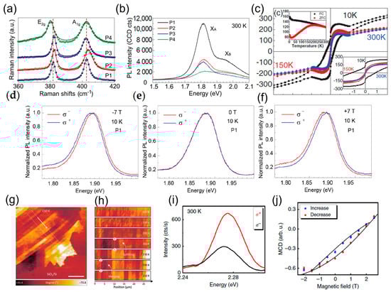 (a) Raman and (b) PL spectra of Fe-doped monolayer MoS2 at room temperature [34]. (c) The hysteresis loop of Nb at 1% and Co at 4% co-doped WSe2, along with zero-field-cooled (ZFC) and field-cooled (FC) curves shown in the top left inset, and the magnified M–H curves in the bottom right inset, provide a characterization of the magnetic properties at different temperatures [48]. (d) The normalized raw polarization-resolved valley exciton photoluminescence (PL) spectra of Fe-doped monolayer MoS2 without a magnetic field (e) and under ±7 T (d–f) at 10 K [34]. (g) MFM phase image of 0.1% V-doped WSe2 taken at 150 K. (h) Temperature-dependent transition of magnetic domains [57]. (i) The red and black spectra represent the Fe-related spontaneous emissions under excitation with opposite circularly polarized light states at 300 K. (j) Corresponding magnetic circular dichroism (MCD), as a function of increasing (blue circles) and decreasing (red circles) magnetic fields, recorded at 4 K [47].