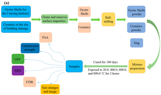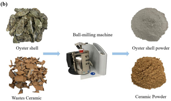 Three waste raw materials, GBFS, CP, and OSP, were used in this study for the preparation of triple-base-activated materials. When pig iron is manufactured, GBFS is a waste slag released from a blast furnace. The GBFS used in this study was provided by the Asian Cement Company in Seoul, Korea. We recycle discarded oyster shells from the catering industry. That is because the restaurant industry produces vast amounts of oyster shells each year, putting pressure on the environment [13,14]. Collection of ceramic waste from building destruction. This is because the main waste generated during the destruction of buildings is concrete and ceramics [27]. The ceramic waste and oyster shells were washed first to remove surface impurities. After that, an oven was used to dry the ceramic waste and oyster shells for 24 h at 105 °C. Finally, the samples were crushed and ground with a ball mill to produce CP and OSP. The balling time is 30 min, and the instrument used is Planetary Ball Mill PM 100. Figure 1a is a flowchart of the experimental plan. Figure 1b shows the preparation process of the OSP and CP in the laboratory. Table 1 lists the results of the X-ray fluorescence analysis of their chemical compositions. The main oxide composition of GBFS and OSP included CaO, and the main oxide composition of CP was SiO2. According to calculations, the OSP used in this study contained 97.88% calcium carbonate and was comparable to the data reported in the literature [17].