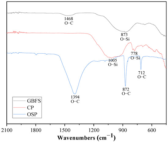 Figure 2 displays the results of measuring the particle size distribution of GBFS, CP, and OSP using a particle size analyzer (Model Mastersizer 3000, Malvern Instruments Ltd, London, UK). Their median particle sizes were 12.3, 7.93, and 4.55 μm, respectively. The vibrational signatures of chemical bonds in raw materials can be studied using FTIR spectroscopy. The FTIR (PerkinElmer, Waltham, MA, USA) spectra of the GBFS, CP, and OSP are shown in Figure 3. The absorption peak of the O–C bonds in OSP was particularly obvious. This is the same as the result of XRF, the compound in OSP is relatively single. In addition, combined with the literature [16], the single substance here is CaCO3. Shells are usually not made of pure calcium carbonate because they would be too brittle. Only a small percentage of proteins (<5%) are then gluing the calcium carbonate lamellae. The FTIR spectra or TGA measurements can find evidence of the presence of proteins. The effect of the presence of proteins on the properties of geopolymer should be investigated in future work. It is worth noting that absorption peaks of O–Si bonds exist in the raw material GBFS, in addition to the few absorption peaks of O-C bonds. This indicates that there is a small amount of CaCO3 in the GBFS, which is the reason for the CO32− hydrotalcite phase in the alkali-activated product.