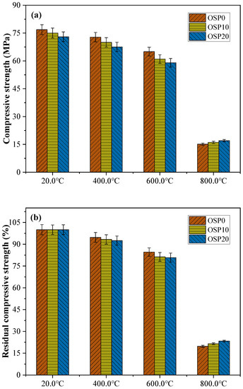 (a) The compressive strengths of OSP0, OSP10, and OSP20 samples cured for 180 d and exposed to 20.0, 400.0, 600.0, and 800.0 °C; (b) The percentage residual compressive strengths of OSP0, OSP10, and OSP20 samples exposed to 400.0, 600.0, and 800.0 °C.