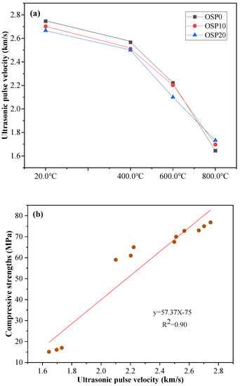 In addition, by carefully observing the test results of the compressive strength and UPV, it was found that the development trends of the UPV and strength of the OSP0, OSP10, and OSP20 samples at different temperatures were similar. The UPV and compressive strengths were compared, as shown in Figure 6b. At different temperatures, with the increase in OSP content, the strength and UPV of the OSP0, OSP10, and OSP20 samples exhibited a similar development trend. To further analyze the correlation between the UPV and compressive strength of the OSP0, OSP10, and OSP20 samples, a correlation analysis between the compressive strength and UPV of the OSP0, OSP10, and OSP20 samples exposed to different temperatures was carried out, as shown in Figure 6b. The strengths of the OSP0, OSP10, and OSP20 samples exhibited a good linear relationship with UPV, and the correlation factor, R2, was 0.90.