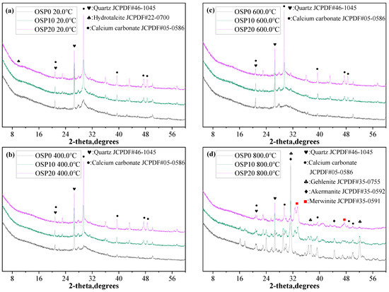 OSP0, OSP10, and OSP20 samples’ 180-day XRD patterns; (a): 20.0 °C, (b): 400.0 °C, (c): 600.0 °C, and (d): 800.0 °C.