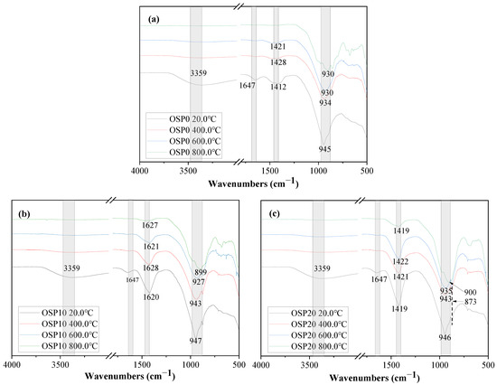 The FTIR spectra of OSP0, OSP10, and OSP20 samples heated to different temperatures are reported in Figure 8. At 20.0 °C, the absorption peak caused by the stretching vibration of the O-H bond appears near wave number 3359 cm−1, while the absorption peak caused by the bending vibration of the O-H bond appears near wave number 1647 cm−1 [41,42]. At about 1421 cm−1, the absorption peak of the O-C bond can be observed. With increasing OSP content, the O-C bond absorption peak’s intensity rises. The OSP’s calcium carbonate content caused this. Absorption peaks caused by asymmetric stretching vibrations of O–Si(Al) bonds in CASH gels appear in the wavenumber region of 998–937 cm−1 [43,44,45].