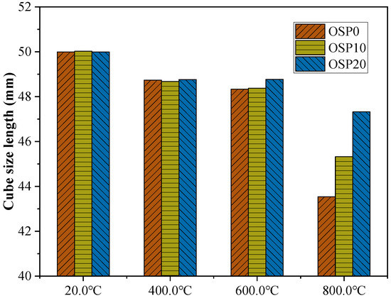 Figure 10 shows the dimensional changes in the OSP0, OSP10, and OSP20 samples exposed to different temperatures. All mixtures shrink when the temperature rises from 20.0–600.0 °C. This is caused by CASH dehydration and partial decomposition. The difference in shrinkage-induced dimensional changes was insignificant for the mixtures exposed to 400.0 °C and 600.0 °C. When the temperature rose from 600.0 °C to 800.0 °C, the mixture shrank sharply with the increase in the OSP content, and the difference in the size change caused by shrinkage was more obvious. The side lengths of OSP0, OSP10, and OSP20 were 43.54, 45.32, and 47.32 cm, respectively. This was caused by the microconstraint effect [46]. The microscopic confinement effect is that when the temperature rises from 600.0 °C to 800.0 °C, the phase transition occurs after the decomposition of CASH, resulting in a massive change in the macroscopic size. After the addition of OSP, OSP was relatively stable at high temperatures, but part of the OSP decomposed and generated CaO after decomposition. Undecomposed OSP and decomposed CaO constrained the deformation caused by the decomposition phase transition of CASH. Compared with OSP20 containing OSP, the surface of OSP0 became more uneven. This also shows that the addition of OSP suppresses the uneven shrinkage of the mixture.