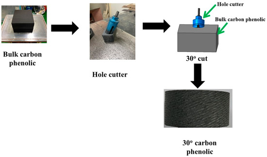 Figure 1 shows the fabrication process of the carbon–phenolic material used in this study (final density ≈ 1340 kg/m3). First, a bulk carbon–phenolic block was fabricated by combining a rayon-based carbon fabric with a resol phenolic resin, followed by vacuuming and hydro-clave processes. The desired lamination angle of 30° was obtained by cutting the processed bulk carbon–phenolic block using a hole cutter at an angle of 30°.