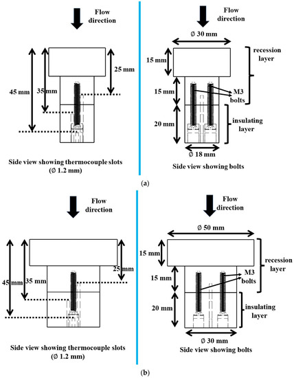 Figure 2a,b show the specimen dimensions. The actual specimen photographs are shown in Figures 10 and 15. Each of the smaller size specimens had a stagnation surface diameter, i.e., the surface that was exposed to the test flow, of 30 mm, and these specimens were re-purposed from our earlier study [16] for preliminary investigations at the stationary test condition. The objective of the stationary tests was to evaluate whether the combination of recession and insulating layers could withstand an intermediate heat flux test condition between the minimum and maximum values used in the transient test condition. Each of the larger specimens used for the transient test conditions had a stagnation surface diameter of 50 mm.