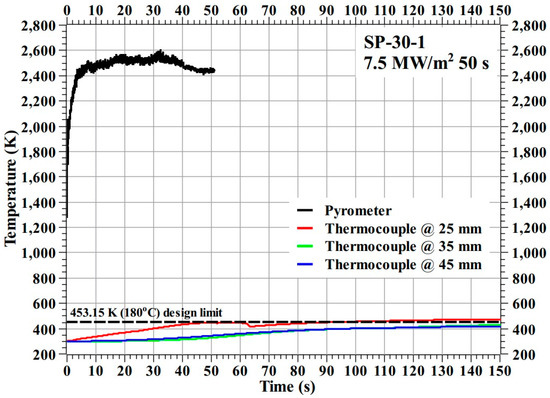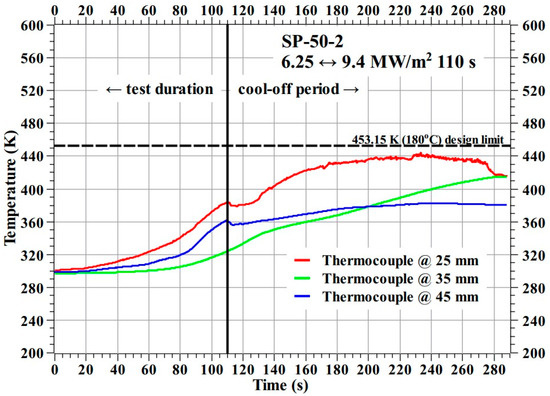 Figure 13 shows the temperature response of the SP-50-1 specimen during the test. During the SP-50-1 specimen test, the thermocouple at the 45 mm location, i.e., the farthest location from the specimen’s stagnation point, failed for unknown reasons. The SP-50-1 specimen’s temperature response during both the plasma test flow and the cool-off period clearly indicated that the internal temperatures at the 25 and 35 mm locations remained well below the design limit of 453.15 K (i.e., 180 °C), as required.