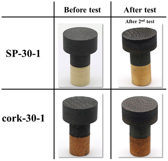 SP-30-1 (7.5 MW/m2, 50 s, 2 times) and cork-30-1 (7.5 MW/m2, 50 s) before and after test images.