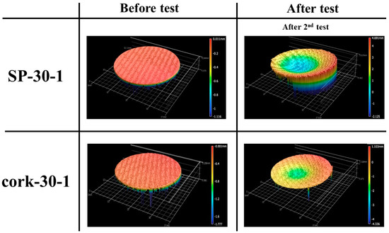 Figure 10 shows the before and after test images of the specimens SP-30-1 and cork-30-1. After-test photographs in Figure 10 show that, apart from slight darkening, the insulating layers were not affected by the tests, and the ablation process was confined to the recession layers, as intended. Figure 11 shows the before and after tests exposed surface morphologies of the specimens SP-30-1 and cork-30-1, taken using the three-dimensional optical/non-contact measurement system (i.e., the VR-5200 measurement system). It is important to note that the after-test images of the SP-30-1 specimen shown in Figure 10 and Figure 11 were taken/measured after its second stationary test. Figure 10 and Figure 11 show that, as expected, recession in the SP-30-1 specimen was more severe than that seen in cork-30-1 due to twice the test duration. This can be confirmed by the recession values, i.e., the difference between the length of the specimen before and after the test, which are shown in Table 3. The recession value of the SP-30-1 specimen is approximately 2-fold greater than that of the cork-30-1 specimen. Table 3 also shows that the SP-30-1 specimen’s mass loss was 1.6-fold greater than that of the cork-30-1 specimen.