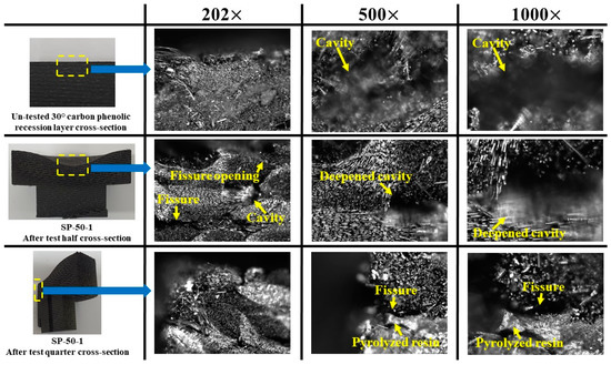 Figure 17 shows a comparison of magnified images at 202, 500, and 1000 magnification levels for an untested carbon–phenolic recession layer’s top surface and the SP-50-1 specimen’s stagnation point after the test. The magnified images are useful for understanding the specimen ablation process. Figure 17 clearly shows that well-developed fissures were formed on the SP-50-1 specimen’s surface during the test. These fissures were formed and developed due to the percolation of pyrolysis gas to the specimen’s surface during the test. Leftover pyrolyzed resin in the form of clumps was also formed on the SP-50-1 specimen’s surface during the test, as seen in Figure 17.