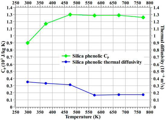 First, Cp (specific heat at constant pressure) and thermal diffusivity (α) of the silica–phenolic material used in this study were measured up to 773.15 K (i.e., 500 °C) using an LFA 467 Hyper Flash apparatus from NETZSCH, Selb, Bavaria, Germany. Figure 19 shows the measured Cp and thermal diffusivity values of the silica–phenolic material. Then, using the measured Cp and thermal diffusivity values, the thermal conductivity (κ) of the silica–phenolic was determined using Equation (1) (where is material density). The values for Cp, thermal diffusivity, and thermal conductivity of the 30° carbon–phenolic material, i.e., the recession layer used in this study, up to 773.15 K (i.e., 500 °C) are provided in our previous study [16]. The values for thermal conductivity of the Cork P50 material up to 523.15 K (i.e., 250 °C) can be found in [38].
