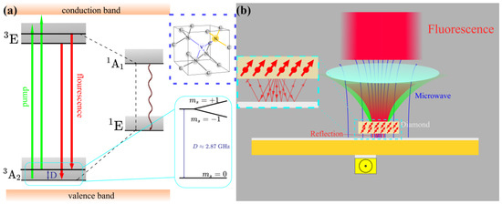 (a) Fundamental physical property of NV. (b) Microwave irradiation and fluorescence reflection of CSRR.