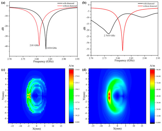 Antenna Performance Schematic. (a) S11 parameters simulated with and without diamond on CSRR. (b) S11 parameters tested with and without diamond on CSRR. (c) Diagram of magnetic field distribution at 10 μm height. (d) Diagram of magnetic field distribution at 500 μm height.