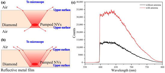 In the measurement, a diamond with diameter of 5 mm and thickness of 0.5 mm was used, with an NV− concentration of about 0.3 ppm. As shown in Figure 4a,b, a diamond with two polished sides was placed between an objective and antenna, and the fluorescence from the pumped NVs that was transmitted upward could be collected. When the reflective metal film was placed below the pumped NVs, the fluorescence that was transmitted downward was also reflected upward and the signal light flux collected by the objective was increased. In this verification experiment, the diamond surface and the antenna metal layer only needed to be smooth, with no defects and scratches, and without additional polishing.
