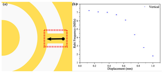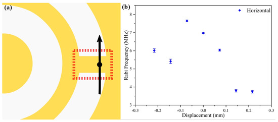 In the subsequent test, the focusing point of the objective was moved back to the center of the width of the metal rectangular sheet by adjusting the knob in the y-direction of the three-axis displacement platform. The length of the rectangular metal in the red dotted rectangular box of Figure 7a was 1 mm in the design for the fabricated sample. The length of the metal rectangular sheet was split into seven approximately equal segments, and the Rabi signal was measured at each node identically, as shown in Figure 7. The Rabi frequency measured at the starting point was about 7.2 MHz. The starting point in Figure 7b was defined as the point near the metal ring and the inner circular patch, shown as the black dot at the starting point of the black line with arrows in Figure 7a. The collected signals are shown in Figure 7b. In these measurement results, the collected Rabi frequency first appeared stable in the range from 125 to 375 μm and then decreased monotonically when approaching the outermost metal layer. For the processed one-dimensional data display, compared to the Rabi frequency spreading along the width direction as in Figure 6a, we could not find the Rabi frequency mutation along the length direction. The data in Figure 7b show that the Rabi frequency was able to present a uniform distribution over a range from 125 to 375 μm. Since an assumption was made that the width of the rectangular sheet might not be aligned with the y-axis of the three-axis displacement platform, as noted in the previous section, it could also be assumed that the length of the sheet would not be aligned with the x-axis of this stage. However, the spreading of the Rabi frequency along the x-axis was still smooth. According to Figure 6b and Figure 7b, the Rabi frequency variation was smaller than 2.8% in an area of 250 × 75 μm.