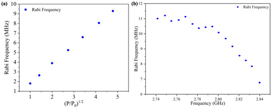 It is certain that the Rabi frequency is proportional to the square root of the MW power. An experiment with a Rabi frequency of 2.7655 GHz for different MW powers was conducted to analyze the performance of the measurement system (Figure 8a). Seven MW powers were chosen as input values to the amplifier, and the corresponding Rabi frequencies were recorded and plotted together. In the condition of reduced MW power, the Rabi amplitude also decreased. The starting point was selected as −12 dBm in order to facilitate the identification and fitting of the Rabi frequency. Then, we changed input power and recorded the Rabi frequency. The data in Figure 8a show that the Rabi frequency increased linearly as the square root of normalized microwave power increased linearly [3,33], (P/P0), where P0 is −12 dBm at the microwave source output.
