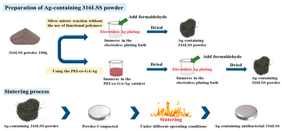 The experimental process is shown in Figure 1. First, 100 g of 316LSS powder was immersed into the PEI-co-GA/Ag catalyst and stirred at 300 rpm at 60 °C to fully contact the metal powder with the catalyst. Secondly, the 316LSS powder containing the catalyst was filtered and dried in a vacuum at 90 °C, then immersed in an electroless plating bath for electroless silver plating. The electroless bath for Ag contains silver nitrate (AgNO3 2 g), ammonia aqueous (NH4OH 15 mL), and sodium hydroxide (1M NaOH 0.5 mL) in 200 mL of deionized water. Next, formaldehyde was added to the electroless bath as a reducing agent. It is worth noting that, in general, the silver mirror reaction is required for more formaldehyde (0.8 mL in the study) to carry out the reduction reaction. However, in the case of functional polymers, the reduction of silver particles can be achieved by lower amounts of formaldehyde. In the study, electroless silver plating was performed by the dropwise addition of formaldehyde (0.4 mL) at room temperature with a reaction time of 4 h. Finally, the Ag-containing 316LSS powder was obtained by filtering and drying under a vacuum at 80 °C for 8 h. In this study, the parameters of sintering, as a process to consolidate powders, were also carried out under operating conditions (at a temperature of around 1100 °C for 200 min in 10−2 Torr) to obtain an optimal product. As shown in Figure 2, the Ag-containing 316LSS powder was molded at 300 N/m2 to a dimension of 11 mm in diameter and 5 mm in thickness. Finally, the optimized Ag-containing antibacterial 316LSS was obtained by a sintering process.