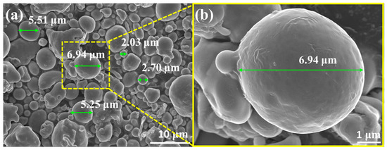 SEM images of raw 316LSS powders: (a) random particle size of about 2–7 μm, and (b) the surface morphology of the powder with high magnification.