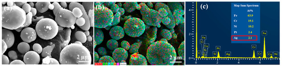 SEM images of 316LSS using the PEI-co-GA/Ag composite after electroless silver plating: (a) the surface morphology of the powders, (b) a particle size of about 300–400 nm, and (c) the EDS element mapping results.