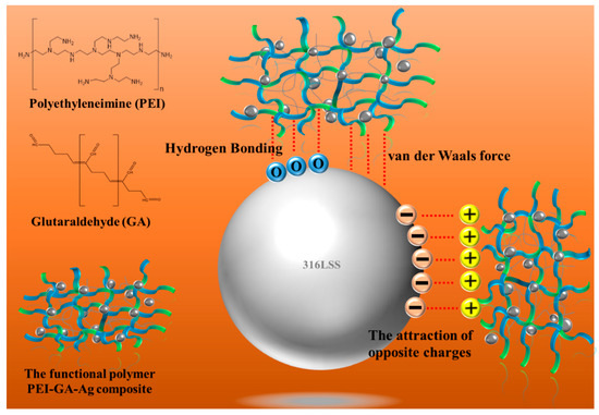 The results further indicated that 316LSS, using the functional polymer PEI-co-GA/Ag, can effectively improve the retention of Ag NPs on metal substrates. Figure 7 displays the interaction of a schematic illustration between the functional polymer and the 316LSS surface.