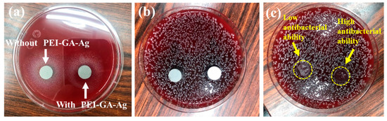 In the pilot study, two methods were introduced to examine the antibacterial ability and effectiveness of 316LSS with/without PEI-co-GA/Ag. First, the Kirby–Bauer Disk Diffusion Test [40,53] was used to examine whether the free silver ions were released. As shown in Figure 8a,b, two disks, 316LSS without PEI-co-GA/Ag and 316LSS with PEI-co-GA/Ag, which reacted for 4 h, were placed on a blood agar plate (Müller-Hinton Agar), spread with a streptococcus strain, and incubated in a 35 °C, 5% CO2 air incubator for 24 h. In Figure 8c, it can be seen that some bacterial strains appeared on the agar plate in contact with the surface of the unuse of the PEI-co-GA/Ag 316LSS. By contrast, the 316LSS with PEI-co-GA/Ag disk showed high antibacterial ability. It further showed no release of free silver ions to affect the surrounding environment (no inhibition zone around it). These results met our expectations of designing passive antimicrobial properties on the contact surface of medical devices.