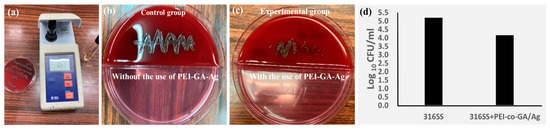 Additionally, the Colony Forming Units (CFUs) were used to examine the antibacterial effectiveness of both disks. As shown in Figure 9a, the CFUs’ assay measures the number of viable microorganisms present in a sample [41,54]. First, we placed two disks, the 316LSS and the 316LSS PEI-co-GA/Ag, which reacted for 4 h, on the streptococcus blood agar plate for 24 h, and then we used a cotton swab to dip the surface of the two substrates for overnight bacterial culture. The result showed that the colonies of the control and the experimental groups were significantly different in Figure 9b,c, respectively. The average CFU/mL distribution of the antibacterial effect of 316LSS with/without PEI-co-GA/Ag is shown in Figure 9d and Table 1. Further experiments will evaluate the antibacterial effect of different Gram-positive and Gram-negative bacteria; in addition, biocompatibility and cytotoxicity studies will also be carefully examined.