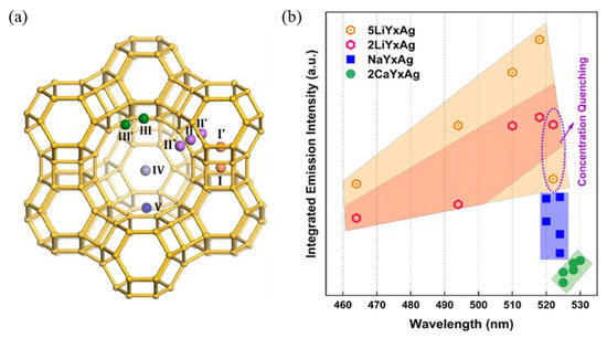 Typical extra framework cation sites I(I’), II(II’, II*), III(III’), IV, and V in the structure of FAU zeolites (a) [57], and summary of the integrated emission intensity and peak position of MYxAg (M = 5Li, 2Li, Na, and 2Ca; x = 5, 10, 20, 30, and 50) (b) [29].