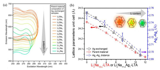 Two-dimensional excited emission spectra of Ag-LTA zeolites with various concentrations of Li+ exchange (a), variations in lattice parameter of unit cell of LixNa12−x-LTA and LixNa11−xAg1−LTA zeolites and Agc−Agc distances of the tetrahedral Ag NCs in LixNa11−xAg1-LTA zeolites (b) [44].