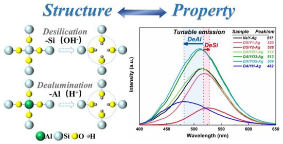 Schematic description of desilication and dealumination processes, and the emission spectra of NaY−Ag, DSiY1−Ag, DSiY2−Ag, DAlYO1−Ag, DAlYO3−Ag, DAlYO5−Ag, and DAlYH−Ag [58].