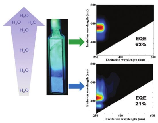 The effect of hydration degree on the luminescence properties of Ag NCs has also been extensively investigated at low silver loading degrees. As shown in Figure 5, the emission of Ag1Li–LTA zeolites shows red-shifted emission from blue to green-yellow with increasing hydration levels [34]. This hydration/dehydration-induced emission wavelength change of Ag NCs can also be observed when confined inside K-, Na- and Ca-LTA zeolites; however, the response is not as fast as in Li-LTA zeolite, which may be due to the lower mobility of those extra framework cations than Li+ [9]. It was also noted that the external quantum efficiency (EQE) of Ag NCs in K-, Na- and Ca-LTA zeolites is below 16%, while Ag1Li-LTA zeolite has a high EQE of up to 62%, due to the pronounced dynamic change in the emissive color of the Ag1Li-LTA zeolite with the degree of hydration and the high EQE, which can be potentially applied as a humidity sensor.