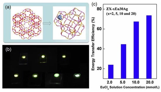 Three-dimensional structure of Na-FAUX zeolite viewed along the [111] direction and Ag NCs located in the D6r cage (a), physical diagram of samples with different ratios of Ag+/Eu3+ exchange concentration (b) and energy transfer efficiency from Ag NCs to Eu3+ (c) [51].
