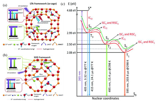The mechanism behind the tunable luminescence of Ag NCs in zeolites attracts great research interest and has been investigated from the aspects of experimental characterization and theoretical calculation. As early as 1962, researchers discovered that Ag NCs loaded Na-LTA zeolites are colorless in a hydrated state, while activating to yellow when highly vacuumed at room temperature and turning brownish red when heated [26]. This hydration state dependence of reversible color change was attributed to electronic charge transfer from the oxygen lone pairs of the zeolite framework to the empty 5 s orbital of Ag+ ions, and known as the ligand-to-metal charge transfer (LMCT) process [67]. Recent studies suggested that the electron transition from the neighboring Ag+-Ag+ metal-to-metal charge transfer (MMCT) state to the ground state may be responsible for the green- and red-dominated emissions in Ag NCs loaded LTA zeolites, as shown in Figure 7a. A similar luminescence mechanism was also proposed for the Ag NCs that are confined inside SOD zeolites, as shown in Figure 7b [54]. The mechanism of Ag NCs in Li+ partially exchanged Na-LTA zeolites was also investigated with the help of temperature-dependent luminescence. It was suggested that the emissions located around 595 (298–233 K), 495 (233–153 K), and 395 nm (153–83 K) are due to the radiative transitions from the triplet states to the singlet states that resulted from the confinement effect of Ag NCs, and the difference between the lowest multiple minima in the excited state potential energy surface lead to different emissions, as shown in Figure 7c [68].