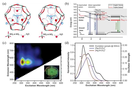 Distribution of [Ag4(H2O)2]2+ and [Ag4(H2O)4]2+ in LTA zeolite sodalite cage (a), energy level structure diagram (b), two–dimensional excitation–emission plot, inset: the picture of an X–ray–irradiated sample under 366 nm illumination (c), and excitation spectrum of Ag3K9−LTA zeolite (λem = 555 nm) and modeled absorption spectra for the [Ag4(H2O)2]2+ and [Ag4(H2O)4]2+ isomers (d) [8].