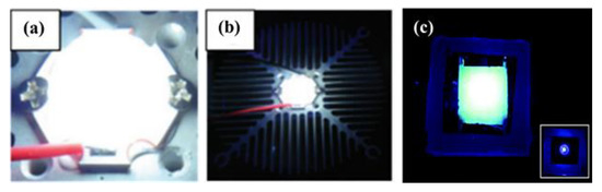White-emitting block on a COB device driven by current (a,b) [6], remote phosphor LED prototype using a thin layer of the green luminescent dehydrated Ag1Li11–LTA zeolite (c) [48].