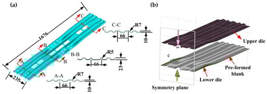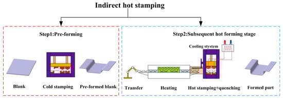 In the context of promoting energy saving and environmental protection in the automotive field, ultra-high-strength steel hot-stamping technology has received much attention from the industry as an effective method to achieve the high-strength and lightweight goals of parts [1,2,3]. Hot-stamping technology can be divided into direct and indirect hot-stamping technology [4]. Direct hot-stamping technology means that the blank is directly sent to the heating furnace for austenitization and then transferred to the dies with cooling water channels for stamping and quenching to obtain formed parts with ultra-high strength [5,6]. The blank is transformed from the original pearlite and ferrite to austenite at high temperature and then achieves ultra-high strength by martensite phase transformation during quenching. Direct hot-stamping technology is often used to manufacture automobile A-pillars and B-pillars, as well as other ultra-high-strength reinforcing components [7,8]. As shown in Figure 1, indirect hot-stamping technology can be divided into two stages [9]. First is the pre-forming stage, which requires the blank to be partially cold stamped at room temperature, where the blank will develop some initial shape and forming depth. This paper defines the second stage as subsequent hot forming, which means the pre-formed blank is transferred to the heating furnace to achieve austenitization and then transferred to the dies with cooling water channels for further stamping and quenching. In contrast to direct hot-stamping technology, indirect hot-stamping technology can form parts with more complex cross-section shapes, larger forming depths, and larger thicknesses, such as the middle channel parts in automobiles [10,11].