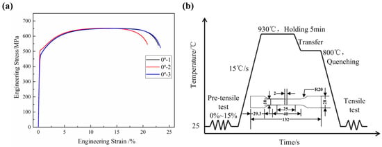 First, the uniaxial tensile test of the blank in the rolling direction (RD) shows that the average elongation is 22.39% (Figure 2a). The specimens experience necking when the elongation is greater than 16%. Secondly, an experimental test system was designed to imitate indirect hot stamping using the RD blank, as shown in Figure 2b. The blanks were first cut into 60 mm wide rectangles and pre-tensiled for different elongations of 0%, 3%, 5%, 8%, 10%, and 15%. This step was similar to the pre-forming stage. The blank underwent different deformations and was represented by different elongations. Then, the tensile specimens were cut in the middle of the pre-tensiled blanks and subjected to the subsequent hot-forming stage. The heat treatment parameters included heating the specimens to 930 °C followed by holding for 5 min to achieve complete austenitization. Then, the specimens were quenched in cold water at 800 °C. Finally, the quenched specimens were subjected to a second uniaxial tensile test to obtain the quenching mechanical properties. Each elongation was tested four times. One specimen was used to cut small samples in the gauge length area with 10 mm × 10 mm for the microstructure characterization and hardness tests, and three specimens were used for the second tensile test to obtain the average quenching mechanical properties.