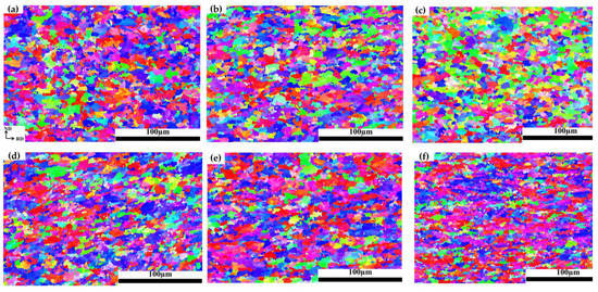 Figure 3 shows the inverse pole figure (IPF) maps of the specimens with different elongations after pre-tensile deformation at room temperature. When the elongation is 0%, the grain morphology is mainly equiaxed grain, and with the increase in elongations, the grains are elongated along the tensile direction. When the elongation is 15% (Figure 3f), the grains are elongated and flattened, and the grain boundaries become fuzzy and fibrous. With the increase in elongations, the average grain size decreases from 6.2 μm to 5.6 μm.